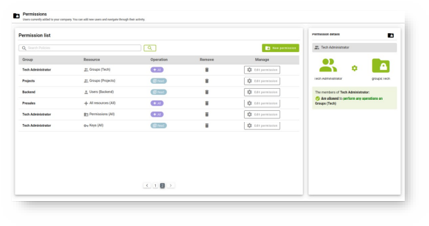 Once the permissions have been created in the “Permissions” section, all the permissions will appear with the assigned resources and the need or accepted operation for each one. These can be deleted and also edited by pressing the “Edit permission” button.