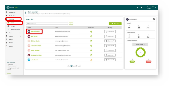 When accessing the Ironchip platform, you will find the company management panel under the "Get Started" tab. Through this panel, you can perform various functions such as managing user access to the services you desire, as well as adding and removing these users, among other functions.