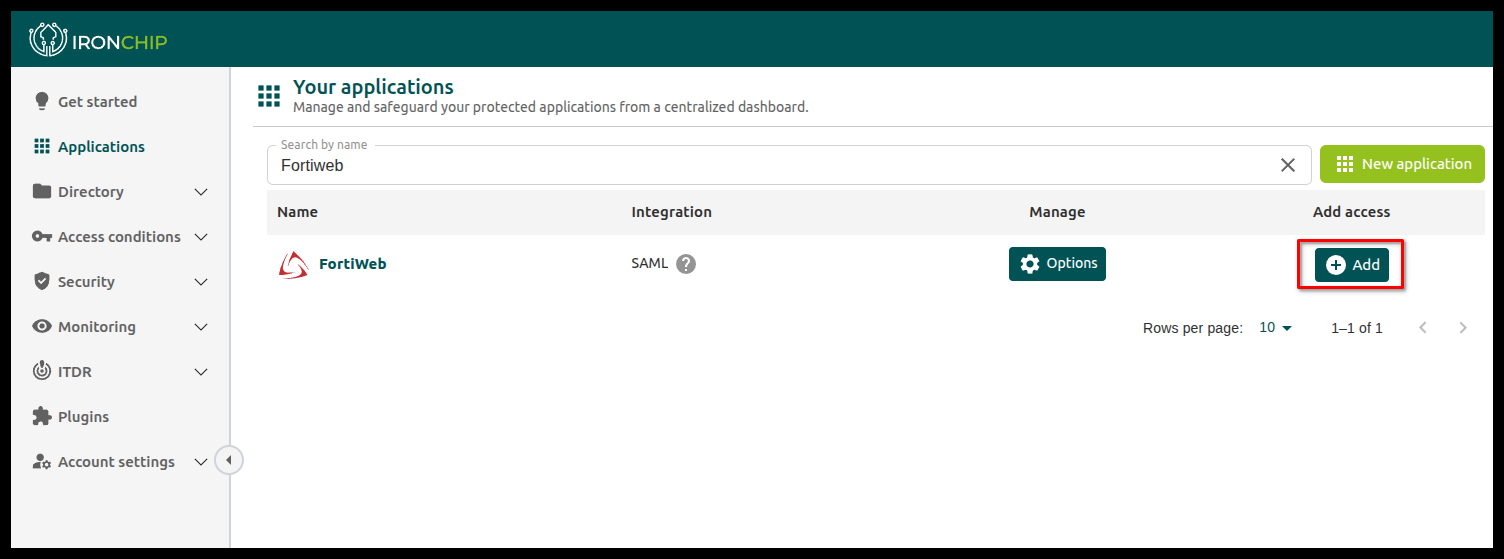 Para ello iremos al apartado de aplicaciones, buscaremos la aplicación generada para Fortiweb y le daremos al botón de Add.
