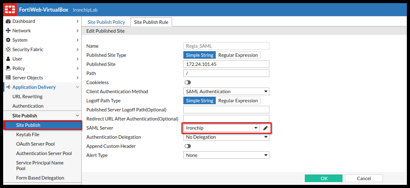 Una vez que tenemos configurado el SAML Server tendremos que aplicarlo a la regla del Site Publish para que pida la autenticación cuando se intente acceder.