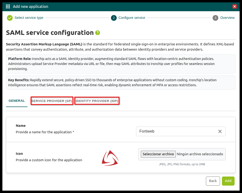 En el apartado de Service Provider podremos importar los metadatos del Fortiweb y en el apartado de Indentity Provider tendremos disponibles los metadatos de Ironchip para importarlos al Fortiweb.