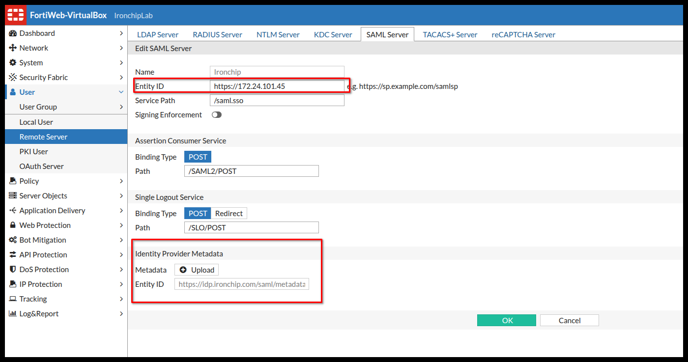 Ahora que tenemos los metadatos de Ironchip, podemos ir al fortiweb y crear el SAML server, para ello iremos al apartado de Users > Remote Server > SAML Server y le daremos a Create New.