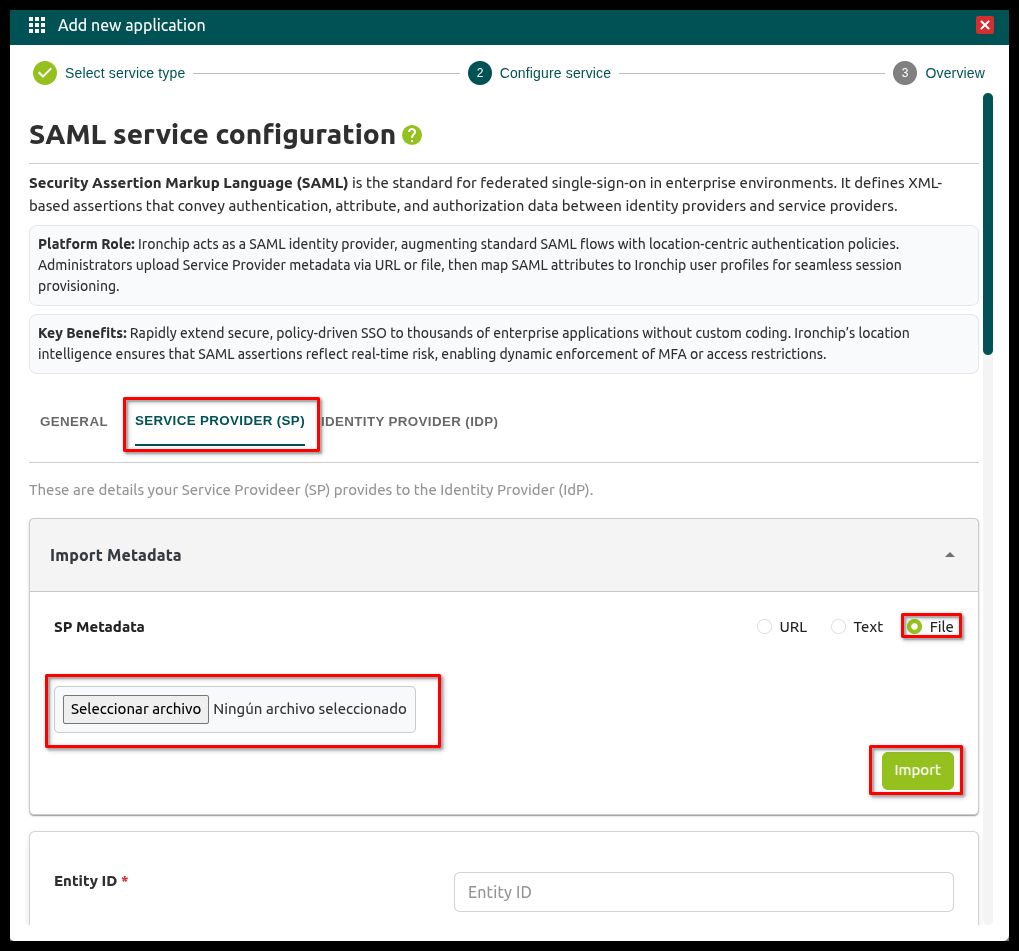 Una vez ahi le daremos un nombre al servidor SAML y estableceremos el Entity ID, en el que indicaremos la ip o dns de la web que queremos proteger. Y por último importamos los metadatos de Ironchip, que los encontraremos al final del apartado de Identity Provider en el panel de Ironchip.