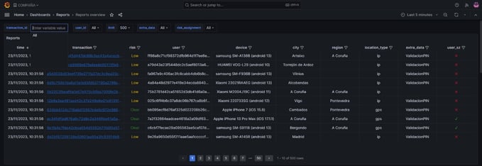 Al ingresar, se visualiza un panel general donde se encuentran el listado de todas las transacciones relacionadas con las operaciones de login que los usuarios ejecutan en la plataforma del cliente. Cada ingreso por login es un evento identificado o definido en ésta herramienta de monitorización como una transacción. Los listados están catalogados por: Tiempo (time), Transacciones (transaction), Alertas de Riesgo (risk), Usuario (user), Dispositivos (device), Ciudad de Operación (city), Región de Operación (región), Tipo de Localización (location_type), Provisión-Validación (extra_data) y Zona Segura (user_sz).