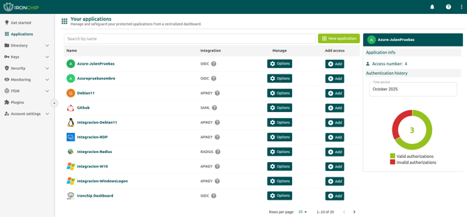 Para añadir la aplicación al panel de control de Ironchip, vaya al apartado aplicaciones > New application y cree una nueva aplicación .