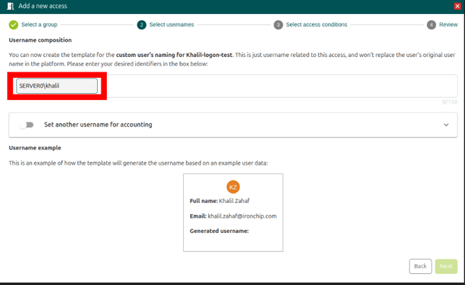 3. Configure el nombre de usuario para que coincida con el nombre del equipo o el dominio \ nombre de usuario. Ejemplo: