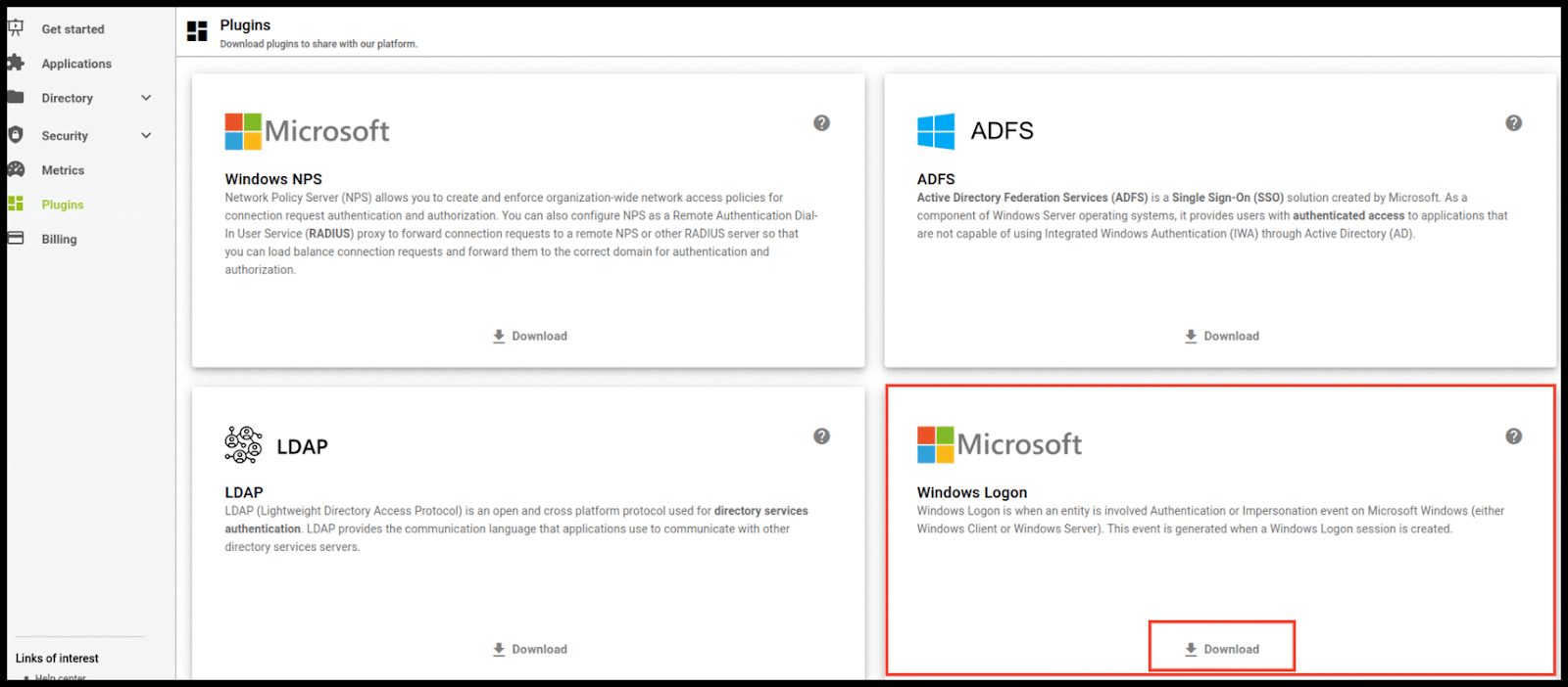 El primer paso es descargar el plug-in de Windows Logon desde la sección plugins del dashboard de administración de Ironchip.