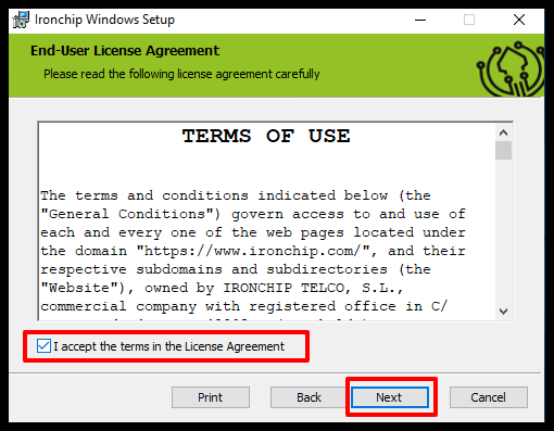 - Pulsamos en Next, en la siguiente pantalla aceptarán los términos de uso y volverá a hacer clic en Next.