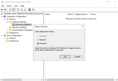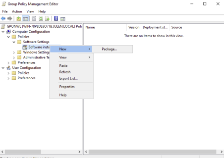 Iremos a Computer Configuration > Policies > Software Settings > Software installation y añadiremos el instalador desde la ruta compartida.