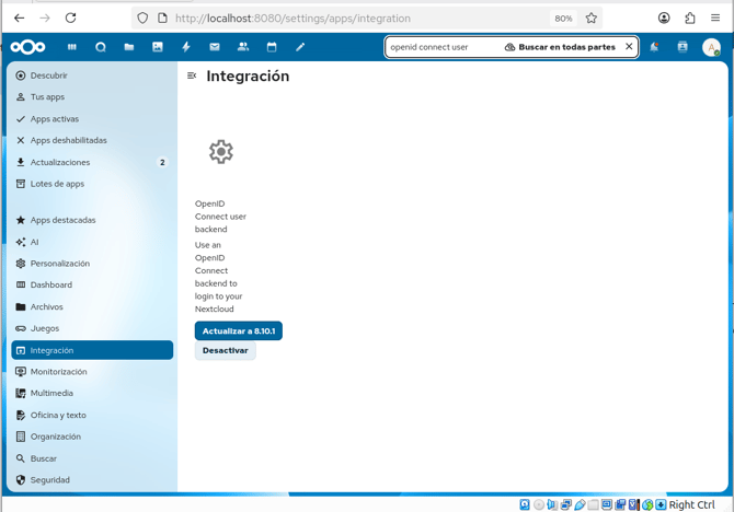Utilice el buscador (icono de lupa) para localizar la aplicación "OpenID Connect user backend".