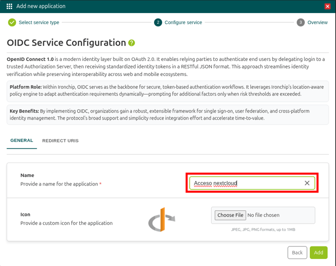 Asigne un Nombre identificativo a la aplicación (ej. "Nextcloud Corporate") y pulse Add.
