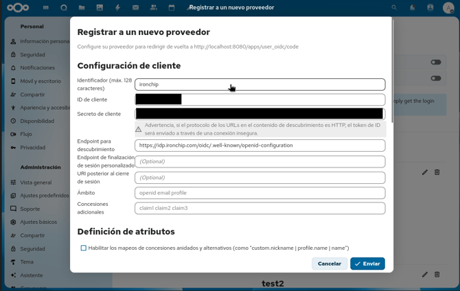 Le daremos al botón de “Enviar” y ya tendríamos integrado Ironchip en nextcloud.